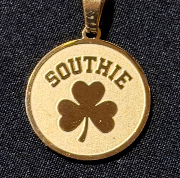 Southie 20mm stainless steel charm on 18" necklace. Available in silver stainless engraved or 14k pvd raised design