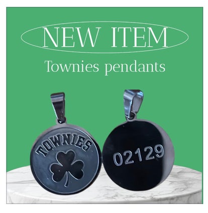 Townies pendant with 02129 inscribed on back. Stainless steel tarnish resistant. Comes with diamond cut chain.
